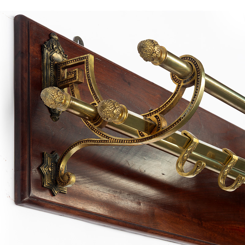 Heavy and gutsy antique French brass portmanteau mounted on a chamfered edge walnut board. (c.1900).