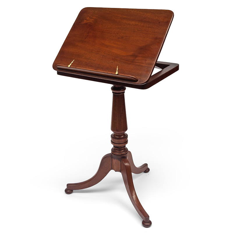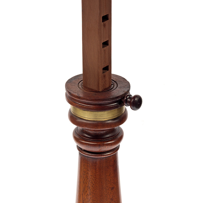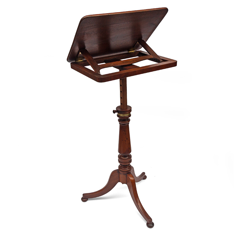 Fully adjustable antique walnut music stand or lectern mounted on bun feet with original brass fittings and brass collar. (c.1860).