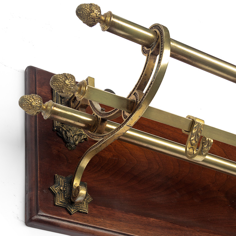 Heavy and gutsy antique French brass portmanteau mounted on a chamfered edge walnut board. (c.1900).