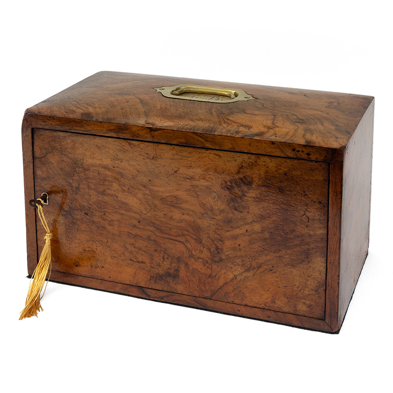 Rare and fabulous antique burr walnut rotating and locking gentleman’s cigar and tobacco cabinet with original key. (c.1893).
