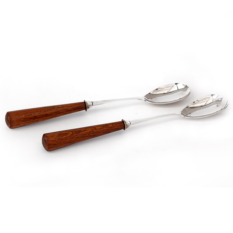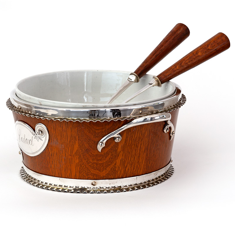 Superb condition polished oak and silverplate salad bowl with porcelain liner together with original spoon and fork servers. (c.1900).